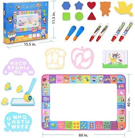 Drawing Mat Size: 60 x 40 inch. Package included: Doodle mat x 1 + Magic pens x 6 + Drawing mold x 8 + Drawing Template x 4 + Drawing Booklet x 1 + Roller Stamp Set x 1 – For age 3 years old +