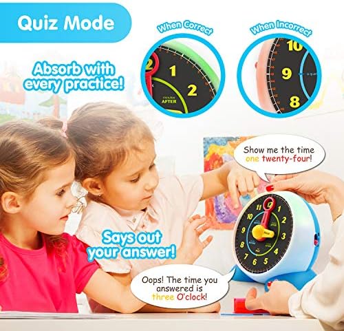 In quiz mode, the learning clock will ask children to set specific times on the clock with the movable hour hand and minute hand. With its colored flashing lights and playful sound effects to indicate whether or not each answer was correct. It will say out the time you answered after 3 wrong answers! Keep them absorbed in every practice!