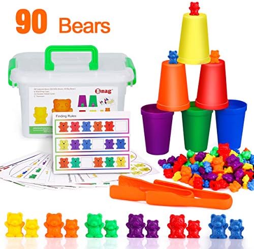 This Montessori Learning Toy set comes with 90 rainbow counting bears(60 little & 30 Jumbo),2 tweezers,6 sorting cups,11 double-sided activity cards, 1 plastic storage box.Perfect for Toddlers Ages 3 and Older,Best fun educational toys for Christmas or Birthday Presents and gifts for kids Toddler.