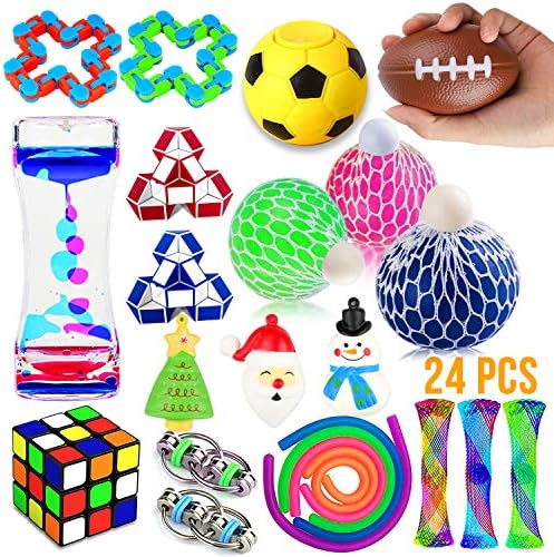 PACK OF 24: 3 mochi squishies, 5 stretchy string toys, 3 mesh and marble sensory toys, 2 tracks fidget toys, 2 snake cube twist puzzles, 1 liquid motion timer, 1 speed cube 3*3*3, 2 bike chain fidgets,3 grape mesh squeeze ball, 1 soccer fidget and 1 American football foam ball.
