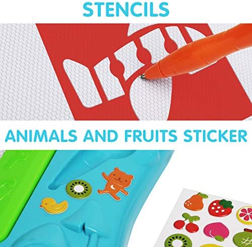 Useful Drawing Accessories: Come with 5 Fruit Stamper Magnets, 6 Plastic Stencils(6 different vehicles), 2 cute Stickers and 1 Extra Replacement Pen.These useful tools help children easy to get start and your child can have more drawing options with these. Adorable stickers help children to décor the board by themselves