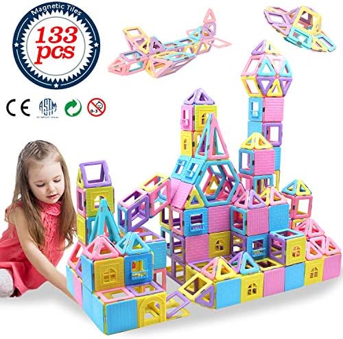 ❤【Multiple architectural models】 The 133 PCS magnetic blocks 3D magnetic tiles blocks kits are come with different shapes of DIY unique models for kid’s brain development.Children can create a variety of 2D planar shapes or 3D geometry. Magnetic building blocks can be combined into houses, balls, sunflowers, castles,aircraft etc., and can be combined with expansion kits to build more large castles and robots.