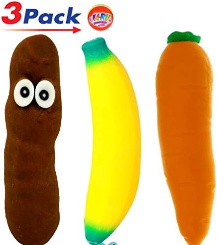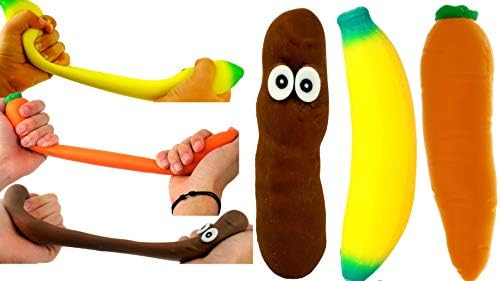 Pack with 3 Units. Super Stretchy Banana, Stretchy Carrot and Stretchy Poopster, Stress Toys for Kids. Sand Filled Squish Yum Buh Nay Nay. Very Durable we Invented This Toy. You can stretch far the stretchy Toys.