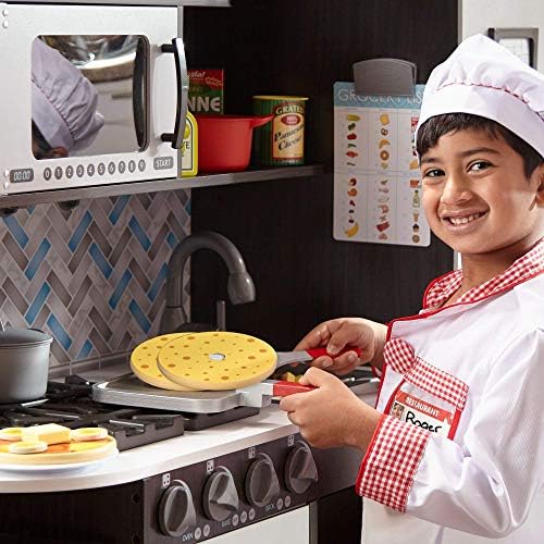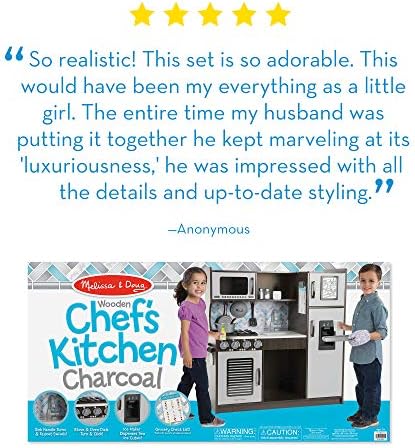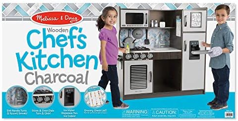 Budding young chefs can hone their craft in this beautifully designed, charcoal-colored modern play kitchen! The easy to assemble chef’s kitchen includes a refrigerator/freezer with innovative working ice maker that dispenses two included “ice” cubes, an oven and stove top with dials that turn, microwave with turning plate, sink with moving faucet and handle, grocery checklist, movable hooks, and ample shelving and storage for easy cleanup. Detailed, illustrated instructions make this kitchen simple to put together. Assembled, it stands approximately 3.5 feet (1 meter) long and more than three feet (0.9 meters) high, roomy enough for multiple kids to play at once. Sturdy, top-quality wooden construction means it will stand up to years of creative make-believe meal-making! Accessories sold separately. Our toy kitchen with “ice” cube dispenser is convenient for parents to assemble, while being roomy enough for several kids to play together at the same time. Add the Melissa & Doug Kitchen Accessories set to round out the pretend play cooking experience. For more than 30 years, Melissa & Doug has created beautifully designed imagination- and creativity-sparking products that NBC News called “the gold standard in early childhood play.” Today, Melissa & Doug is proudly partnering with the American Academy of Pediatrics to foster early brain development and help children build important life skills through play.