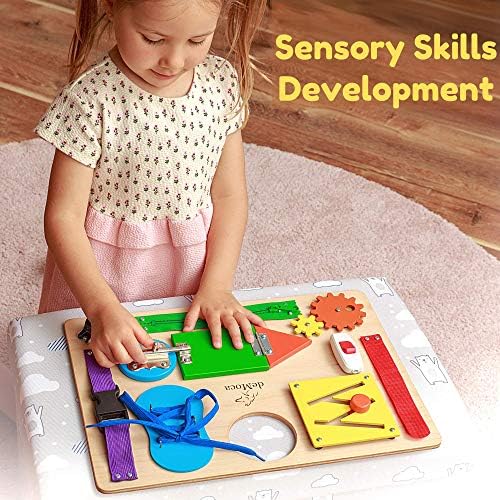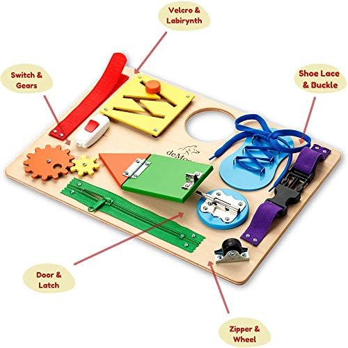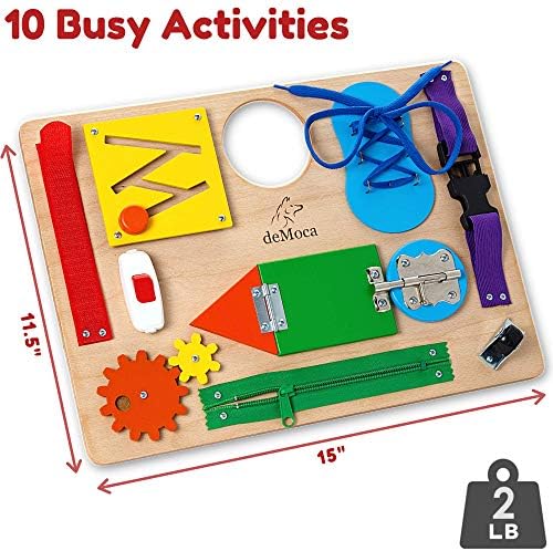 deMoca Busy Board for Toddlers is a set of 10 Bright Rainbow Colorful Activities that helps kids to develop their fine motor skills