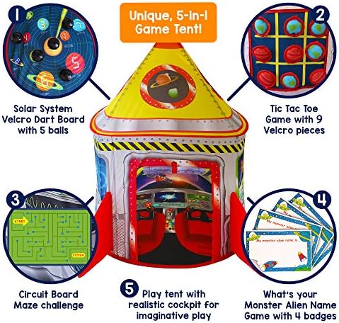 MORE THAN JUST A KID TENT, OUR UNIQUE ROCKET SHIP PLAY TENT for boys & girls incorporates four games into the toddler play house interior and exterior: Space Dart Board, Tic Tac Toe, Circuit Maze and What’s Your Monster Alien Name? Plus, use the realistic and detailed rocket cockpit design on the tent floor for out-of-this-world astronaut imaginative play. Looking for space toys for 4-5 year old boys or girls with a difference? Then THIS is your gift solution.