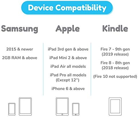► Device compatibility | iOS – iPad 3 and above, iPad mini 2 and above, iPad Air 1 and above, iPad Pro 9. 7 & 10. 5 inch, iPhone 6 & above | Android – Samsung tablets & smartphones, 2015 or newer with more than 2GB RAM | devices – Kindle Fire 7 – 2019, fire 8 – 2018 & newer (fire 10 not supported).