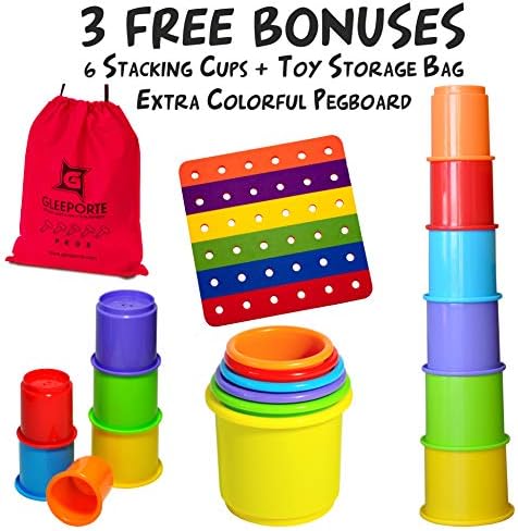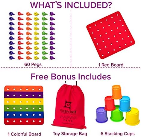 🌏NUMBER COUNTING -COLORS-PATTERNS- Gleeporte’s Stacking Peg board set includes 60 pegs, of 6 different colors and one board. It’ll allow your preschooler child to develop any kind of patterns, stacking the different colors together, while learning and counting the colors and the amounts in the process.