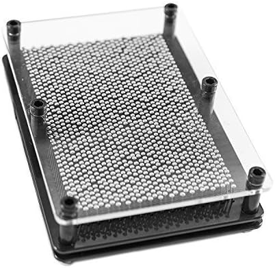 Made of silver metal pins and a sturdy black plastic frame. Pinboard measures 5″ inches wide x 7″ inches tall. Features a thick clear plastic front cover and metal pinscreen design. Inspire creativity and imagination.