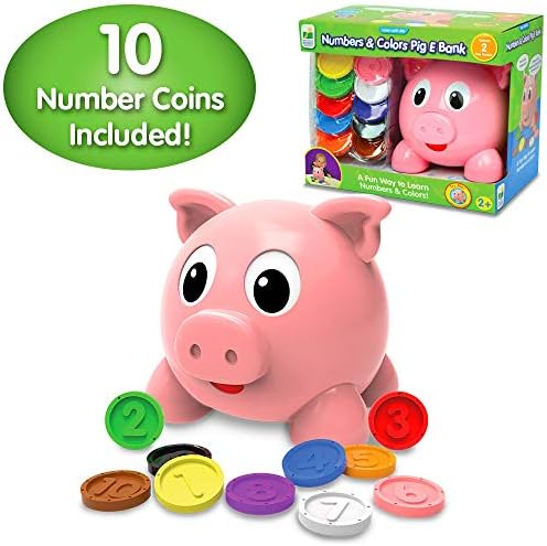 Numbers & Colors Pig E Bank is an adorable interactive learning toy including a talking pig shaped sorter and 10 chunky coins. The Pig E Bank talking toy has 2 play modes: Learning and Find It! Each coin has its own color and shows a bold number 1-10. “Let’s find a green color!” “Let’s find the number 5.” The Numbers & Colors Pig E Bank Electronic Learning Toy will guide your child through the game play. It also will name the colors and numbers, teaching your child early math skills. Children will love placing the shapes in the piggy container and hearing the tasks, cheerful comments, or silly phrases that this tot piggy bank says. All colorful coins store neatly inside the toy.
