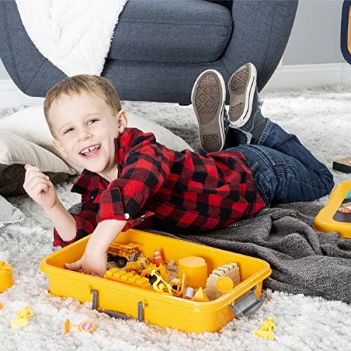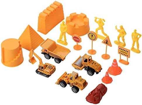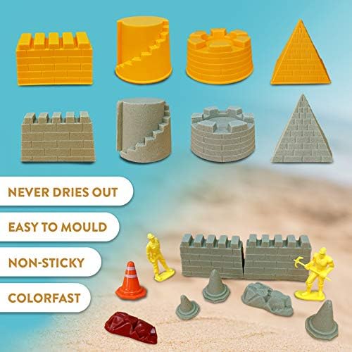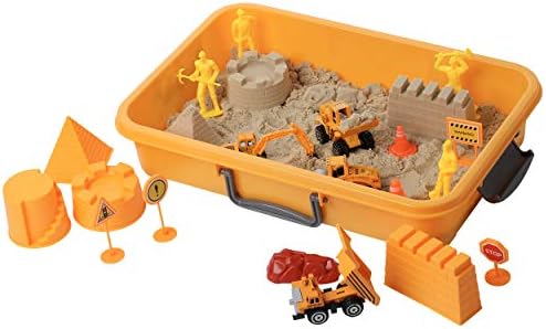 EVERYTHING YOU NEED: This 20 piece tractor sand playset comes with 2 lbs of play sand for hours of entertainment. The sand box includes plastic Road & construction signs and cones, working figures, 4 mold set and roller, dump truck, excavator and bulldozer. The play sand never dries out.