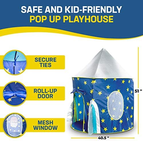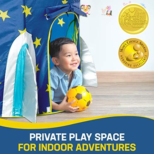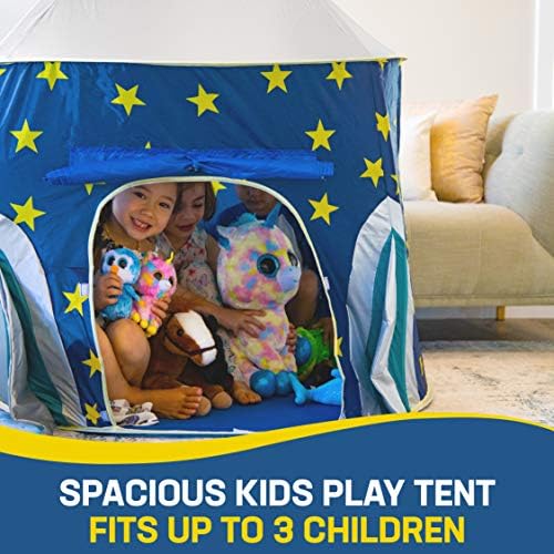 Blast off for exciting space adventures with this play tent that comfortably accommodates up to 3 children. This kids tent measures 41″ x 41″ x 53″ – far larger and more breathable than a typical kids pop up tent or tiny toddler tent.
