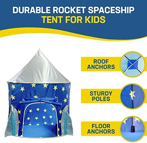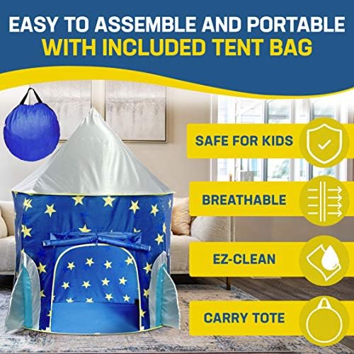 ROCKET SPACESHIP KIDS TENT: This kids play tent includes 1 space projector toy (battery included) with 3 space-themed image slide discs (24 images total), and a tent bag for easy travel and storage