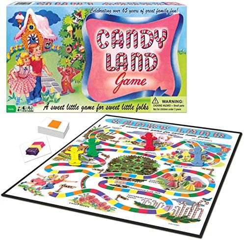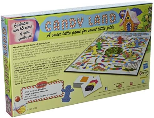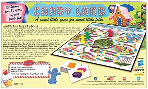 Celebrating over 65 years of great family fun, this classic edition of Candy Land features the charming graphics and components from the game’s early days. Candy Land was created in the 1940’s and has been a favorite “first” game of children ever since. Millions of young children have learned how to recognize colors, practice counting and acquire the skills of taking turns and following directions, all with the help of this delightful game. This simple, race-to-the-finish game, is a rite of passage for all children. In 2005 the game was inducted into the National Toy Hall of Fame at The Strong Museum in Rochester, New York. This edition of Candy Land will bring back fond memories of Gumdrop Mountains, Candy Hearts, the Peppermint Stick Forest, Lollypop Woods, Ice Cream Floats, the Gingerbread Plum Tree, the Crooked Old Peanut Brittle House and Molasses Swamp. Your favorite Gingerbread Men movers are included, along with the traditional deck of colorful cards, which guide each move. The first player to wind their way to the pink-frosted Home Sweet Home wins the game! Playing Time 15-20 minutes for 2-4 players. Contents include a Bi-fold, heavy duty game board, 4 plastic gingerbread men movers, a deck of 64 cards and Instructions that includes “The Story of Candy Land”.