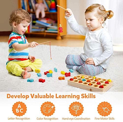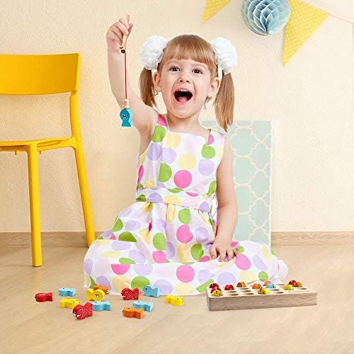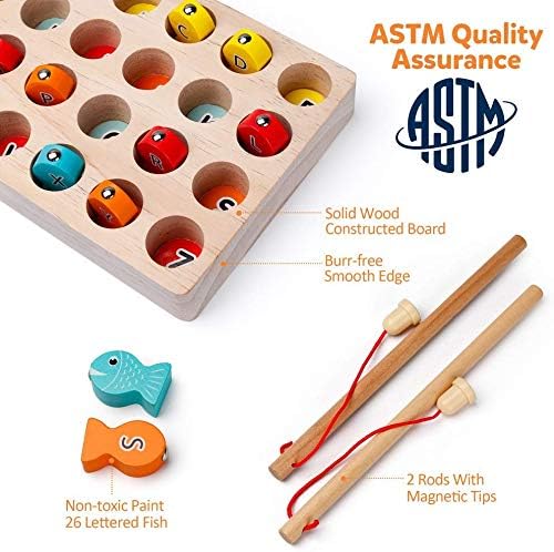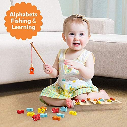 MAGNETIC FISHING GAME : This simple and adorable fishing game offers hours of fun for children ages 3 and up 3 years old. It comes with 2 Wooden Magnetic Fishing Poles, 1 Wooden Sorting Box, 26 PCS Wooden fish. It is not only a fun activity for your little kids, but also is a great toy for learning the alphabet, color recognition!