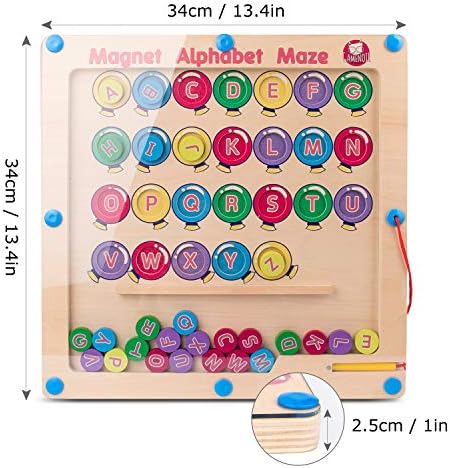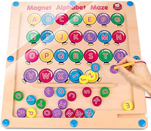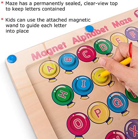 Hands-on Way to Explore the Alphabet: The sturdy hardwood maze has colorful balloons that represent each letter of the alphabet, plus 26 corresponding letter magnets. Kids use the attached magnetic wand to guide each letter into place reinforcing letter identification and alphabet order with every match that they make