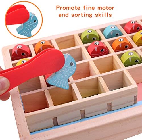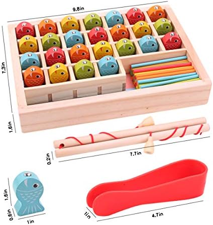 Multicolor Catch Fish Toy: This magnetic fishing game complete with 25 colorful number fishes, 2 fishing rod, 50 math learning sticks, a clip and 1 Wooden Sorting Box. A great game for learning numbers, color cognition and do math game