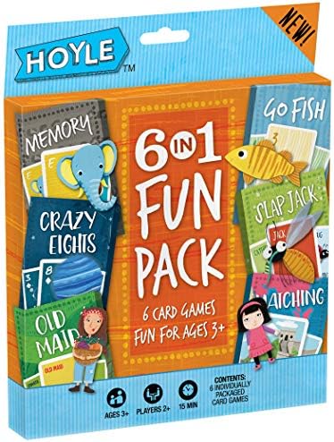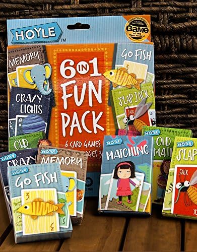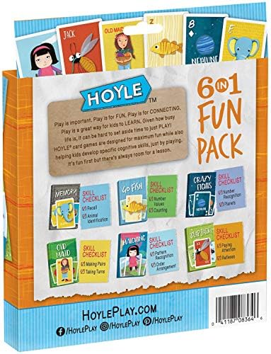 Hoyle 6-IN-1 Fun Pack contains six classic unique-themed kids card games! Games develop learning skills like matching, color identification, counting, A-Z letters, making pairs, planets, taking turns, recognition and more! Fun games for kids & parents!