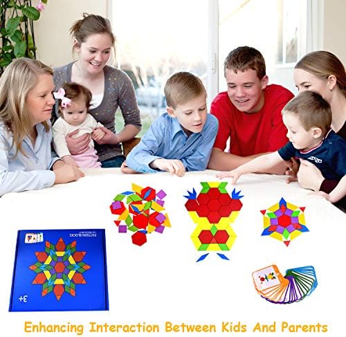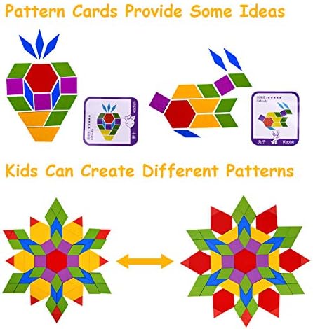 For younger children, the Pattern Blocks can be used to teach counting, sorting, and recognition of colors and shapes, and build the patterns as card shows. For older kids, the blocks can help with introductions to geometry, pattern recognition, symmetry, and encourage them to create more patterns.