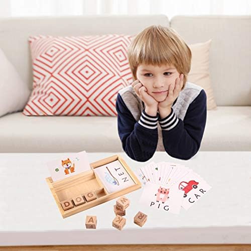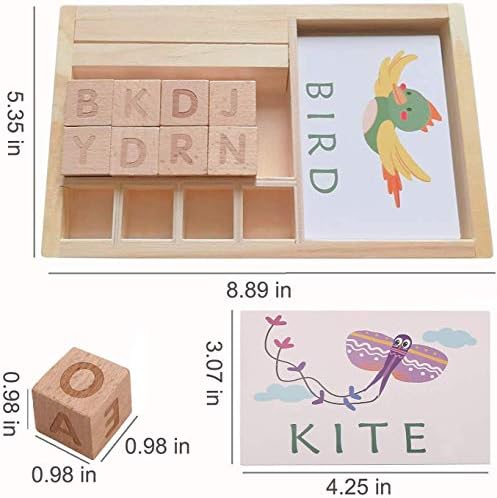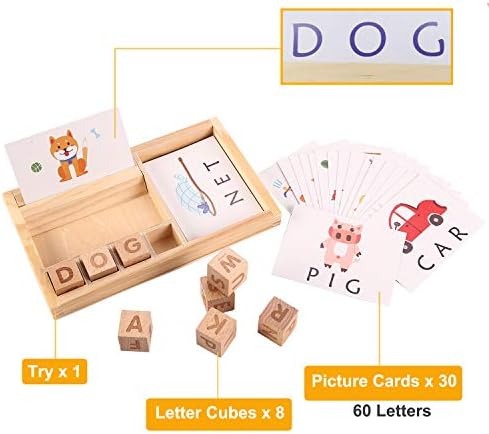 Package including: The matching letter game comes with a wood tray, 30 pcs double side English words cards(60 word cards with 3 and 4 letter words.), 8 pcs alphabet cubes, 1pcs game board.