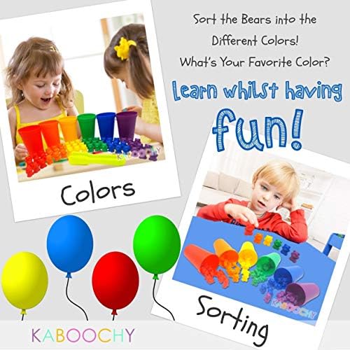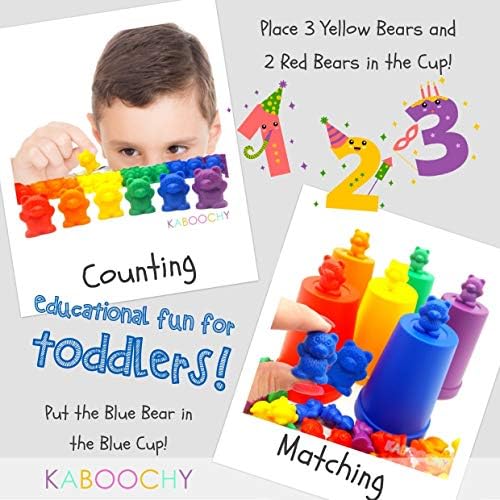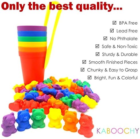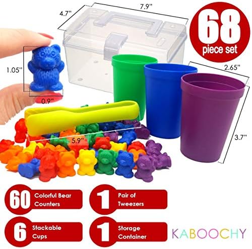 Toys and Games for Pre-Schoolers: KABOOCHY Rainbow Counting Bears with Matching Sorting Cups and Storage Container 68pc Set. Quality Colorful Toy Counters for Kids to Learn Mathematics Games, STEM, Montessori Matching Game