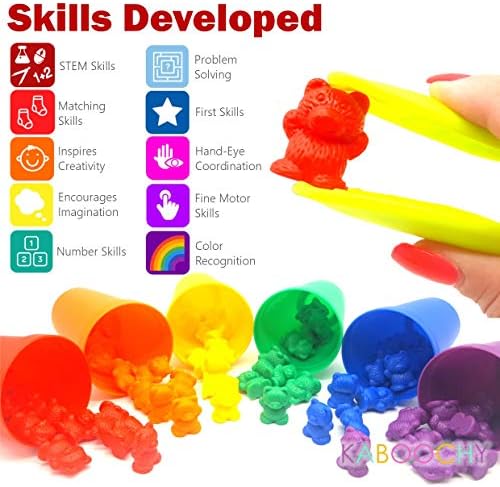 KABOOCHY Rainbow Counting Bears with 6 Matching Sorting Cups, 60 Bear Counters, Tongs and Storage Container