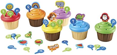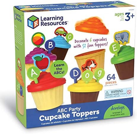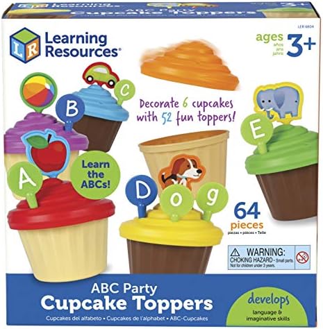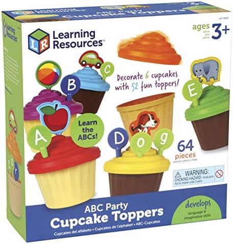 Turn learning the ABCs into a treat-filled party! Kids learn alphabet and early language skills at every tea party with the ABC Party Cupcake Toppers from Learning Resources. This set’s six pretend cupcakes come ready to decorate with 52 letter and picture toppers that help kids work on learning the alphabet, mastering beginning sounds, building vocabulary skills, and more. ABC Party Cupcake Toppers support open-ended play – match the toppers to their starting letters, explore the difference between upper and lowercase letters, or consult the online word list for a guide to spelling simple two- and three-letter words! Toppers double as fun cupcake decorations, and add imaginative treat games of pretend or tea parties for imaginary friends! When playtime ends, the toy cupcakes reveal their neatest trick yet: all 52 toppers store inside the 6 cupcake bases, turning cleanup from a chore to a delight.
