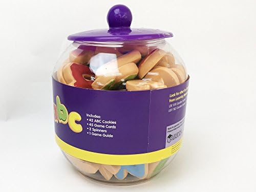 Set includes 42 plastic letter-shaped cookies, 45 double-sided cards, 2 spinners, plastic storage jar, and activity guide
