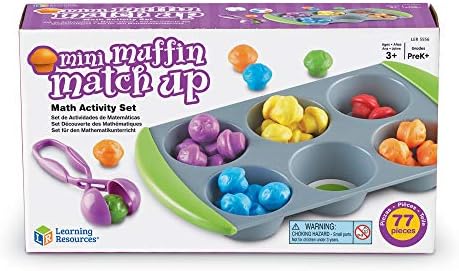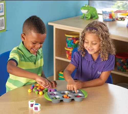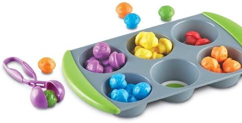 Set includes: 1 muffin pan, 2 dice, Squeezy Tweezers, 12 double-sided sorting circle inserts, 60 mini muffin counters, and activity guide