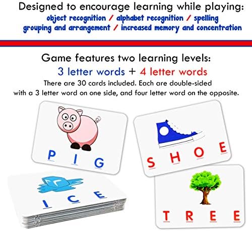 Contents: matching letter game comes with a tray, 8 letter cubes, 30 picture cards, 60 word cards with 3 and 4 letter words