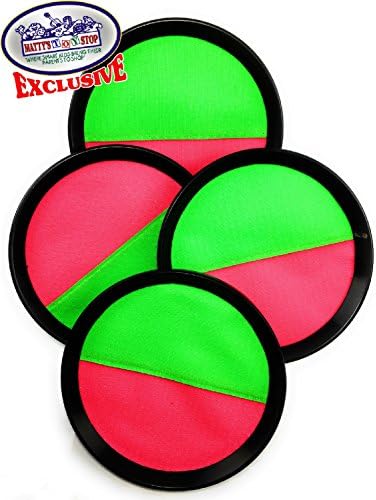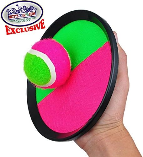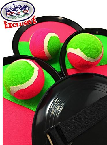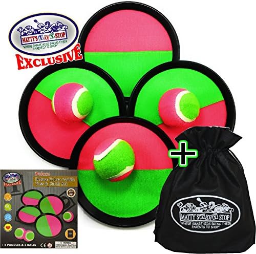 Matty’s Toy Stop Deluxe Toss & Catch (Hook & Loop) Paddle Game Set with 4 Paddles, 3 Balls & Storage Bag, is AWESOME! Perfect for the park, backyard, beach or anywhere outdoors. This set is perfect for up to 4 players, and comes with extra balls. Each paddle has a self-stick front surface and adjustable strap on the back. Players simply stand a distance apart, toss the self-stick ball, and try to catch it on their self-stick paddle. The Toss and Catch game provides a great way to develop hand-eye coordination! With bright colors, the paddles and ball are easy to see. Great fun for all ages.