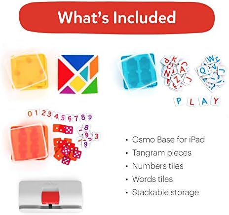 WHAT’S IN THE BOX: Osmo Base & Reflector for iPad, Tangram pieces, Numbers tiles, Words tiles, Stackable storage for each game & 5 Game Apps: Numbers, Tangram, Words, Newton, and Masterpiece.