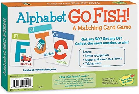 WHO CAN PLAY: 2-6 Players ages 4 and up can enjoy Alphabet Go Fish in this delightful 52 card deck complete with instructions, parent learning prompts and sturdy, easy-to-open packaging.
