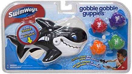 Yum! Yum! Preschoolers can catch, count and learn their colors with the SwimWays Gobble Gobble Guppies pool toy. This hungry friend from the deep has one thing on his mind and on the menu – guppies! Children squeeze the trigger to open his mouth, then try to gobble up all the little guppies as fast as they can while they float by on the water’s surface. Each colorful guppy is numbered 1-4 for an added educational experience to a fun catch ’em game. Sold individually. For children age 2 and older.