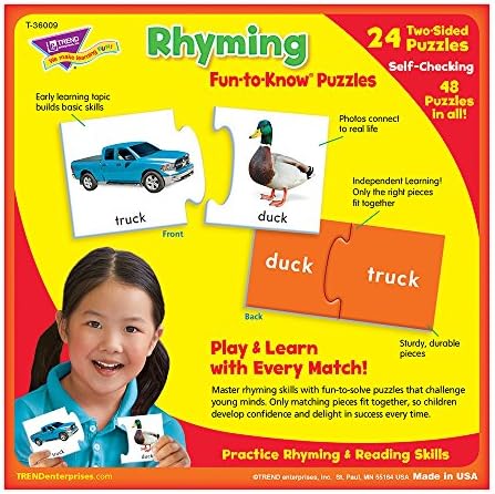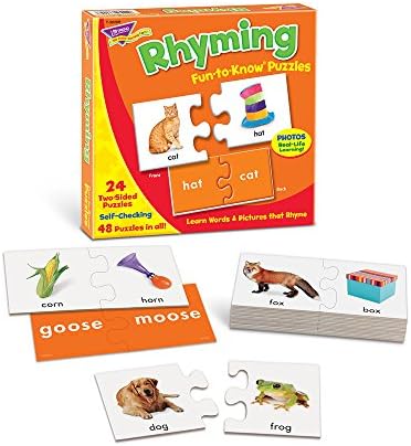 Learn short- and long-vowel rhyming words by matching photo pairs. Format adapts to abilities and features interlocking pieces with photographs for easy recognition and retention. 24 puzzles/48 pieces. Sturdy, durable pieces with self-checking design. Ages 3+.