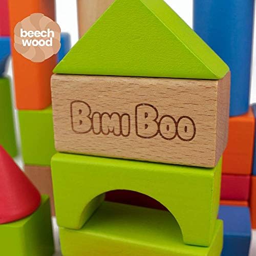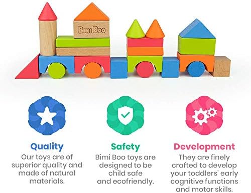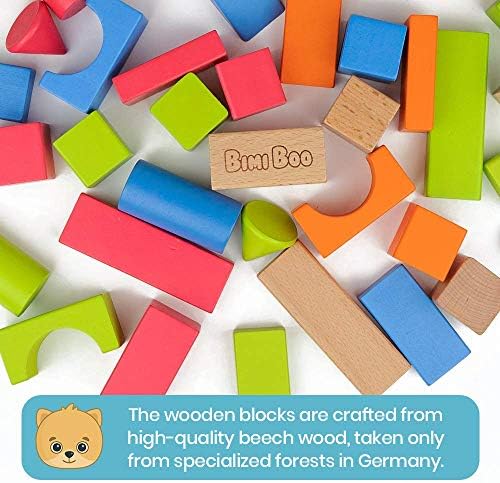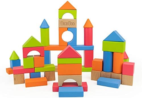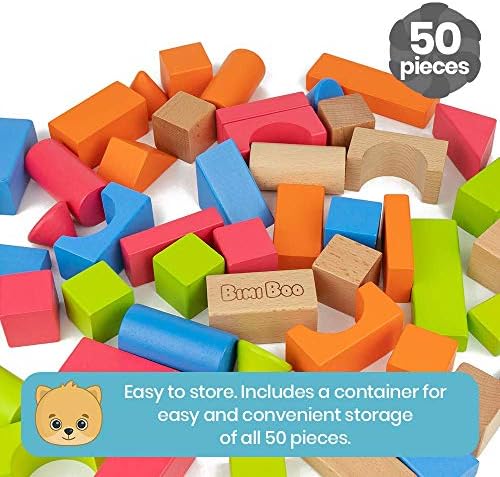 Toys and Games for Pre-Schoolers: Wooden Building Blocks for Toddlers and Preschoolers – Colored Wood Construction Bricks Set for Kids Age 2 (Developmental Toy, Play and Build 50 pcs in Variety of Sizes, Geometric Shapes and Colors)