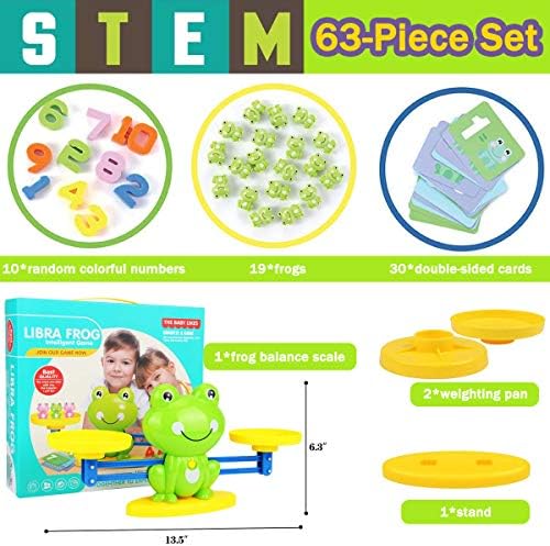 🐸 63-IN-1 EDUCATIONAL PLAYSET: 19frogs, 1 frog balance scale, 1 base, 2 scale pan, 1-10 numbers, 30 double-slided cards,and an easy-to-read instruction manual.