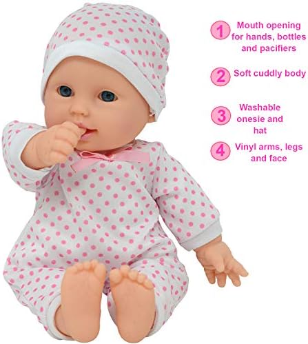 FREE DOLL PACIFIER INCLUDED – Caucasian Soft Baby Doll with Amazingly Detailed Vinyl Head, Arms, and Legs. This BABY DOLL comes Dressed in a Polka Dotted Onesie and a Sweet Little matching Hat