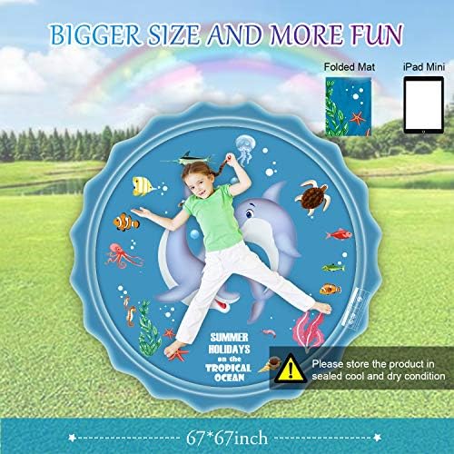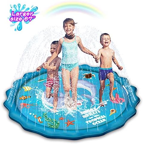 【Super Size Kid Sprinkler Mat】This upgraded sprinkler toy has a large diameter of 67 inches, which provides more space for children to play and enjoy the fun, suitable for up to 4 children. The water jet height can be adjusted by adjusting the speed of the nozzle for your convenience.