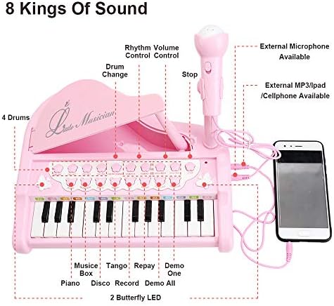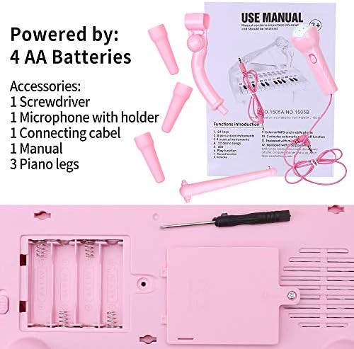 【Multifunctional】: 24 keys, 8 percussion instruments, 4 musical instruments, 22demo songs, different volume and rhythms, “play & record”, Karaoke, LED, external MP3 and mobile phone, equipped with microphone.
