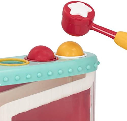 have a ball with 4 colorful balls, 1 tower toy station, and 1 hammer toy! Place the balls in their color-coded sockets… and whack! See them roll down! See the little red Star spin as the balls make their way down! A sturdy ball and hammer toy tower with a detachable base to collect the balls when they exit the maze. Remove the base to have the balls roll randomly across the room! Perfect to get little ones crawling, toddling and moving. A cause-and-effect masterpiece, The Battat pound & roll is made of sturdy, durable and worry-free materials. Build strong motor skills, and spend hours of rewarding and educational play with this interactive baby activity center. Ready, set, whack!