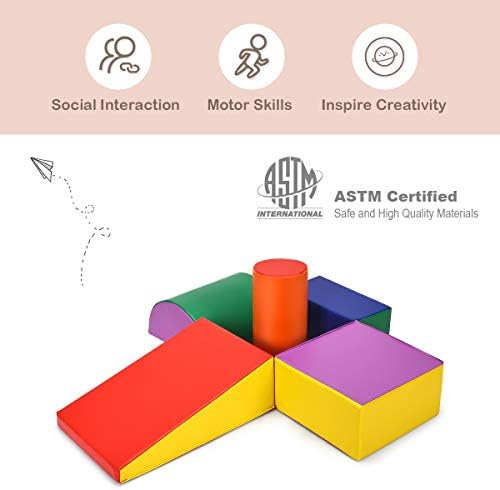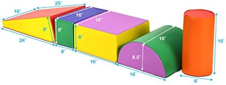 Our toy set consists of a square, a rectangle, a wedge, a cylinder and a half-moon, all of which are rich in color. Your kid can use it to climb, slide, walk and play to add fun.
