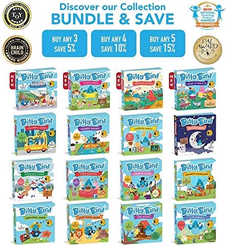 The award-winning Ditty Bird interactive book series includes 17 beautifully illustrated musical and sound books for Babies and Toddlers ages 6 months to 3 years: