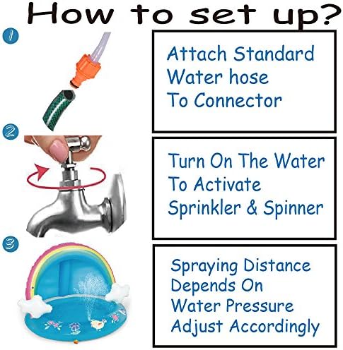 Easy Set Up: There are only 3 simple steps that you can set it up. What you need to do is inflated the valves, connected the wading kiddie pool to any standard water hose, then your baby can start enjoying water fun immediately!
