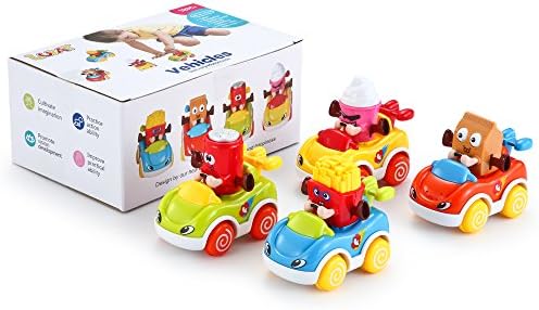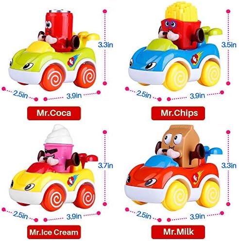 CUTE CARTOON VEHICLES SET: 4 adorable bright colorful car toys with funny face, including Cola Car, Chip Car, Ice cream Car and Milk Car. Any kid will be attracted by the cute cartoon image.