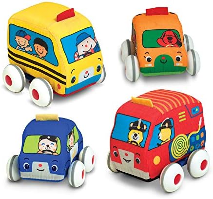 INCLUDES 4 SOFT VEHICLES: The Melissa & Doug Pull-Back Vehicles set for babies and toddlers includes 4 safe, soft vehicles including a school bus, family car, fire truck, and police car.
