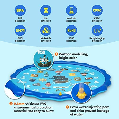Durable Quality Material –Obuby sprinkle & splash play mat is made of high quality 0.30mm thickened ,tested, certified, safe PVC material, BPA-free and phthalates free,30% thicker than other inflatable water toys,reducing cracking and tearing, non-toxic and nore durable.High quality edge sealing technology makes it not easy to burst.