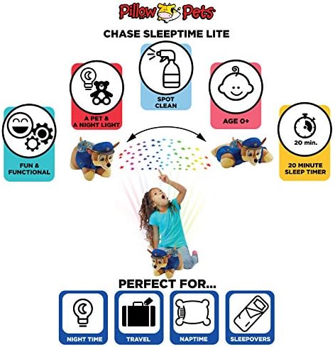 Pillow Pets brings you one of the most popular Nickelodeon characters of all times; Chase, from Paw Patrol! The German Shepherd inspired pillow pet dream Lite keeps you feeling safe at night and is the plushest, friendliest, and softest stuffed animal you will find. The Nickelodeon paw Patrol Pillow Pets Chase sleep time Lite will illuminate your room and turn your ceiling into a Starry night sky with the touch of a button. This amazing nightlight projects four light options: steady amber, blue, or green, or a combination of all three colors alternating continually every four seconds. Pillow Pets Sleepy-Time Lites are anything but just another toddler pillow. Fold up into a pet for imaginative play during the day, or open and lay flat at night to keep you company as a nightlight. Children will rest easy knowing their Sleepy-Time Lite will light up the room with soothing-colored stars, allowing them to transition into a peaceful dream world. Parents will appreciate the built-in timer that automatically shuts off after 20 minutes, giving little ones enough time to drift off to sleep. This super-soft Chenille plush folding stuffed animal is so cuddly they’ll never want to put it down! Starts out as your pal, then unfasten its belly and quickly becomes a comfortable pillow! Enjoy a great and fun bedtime solution that will have your kids running to their room with their new pet for a good night’s rest on their new favorite pillow. Made of high- quality soft chenille plus. Bpa and phthalate free. Requires (3) AAA batteries (not included. ) as with all decorative pillows, not recommended for children under the age of 3.