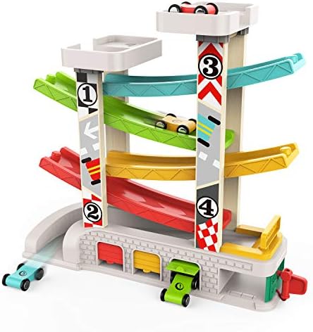 UNIQUE DESIGN: Our car ramp toy for 2 year old boy and girl is specially designed with parking lots, 3 car garages, a gas station and a repair shop, simulating real-life traffic situation. Toy cars can set off from parking lots at the same time and then slides down the rainbow race track for toddlers smoothly, improving toddlers’ visuals tracking ability.