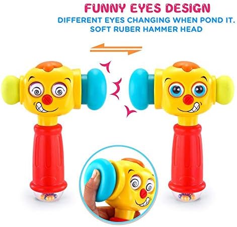 FUNNY EYES DESIGN & SOFT RUBER HAMMER HEAD BABY TOYS– Cute Carton eyes will change when pond the baby hammer and the soft ruber head can protect your baby’s safety; Having a shake, you can see color beads from bottom of the baby hammer toys which helps baby to have a sensory stimulation.